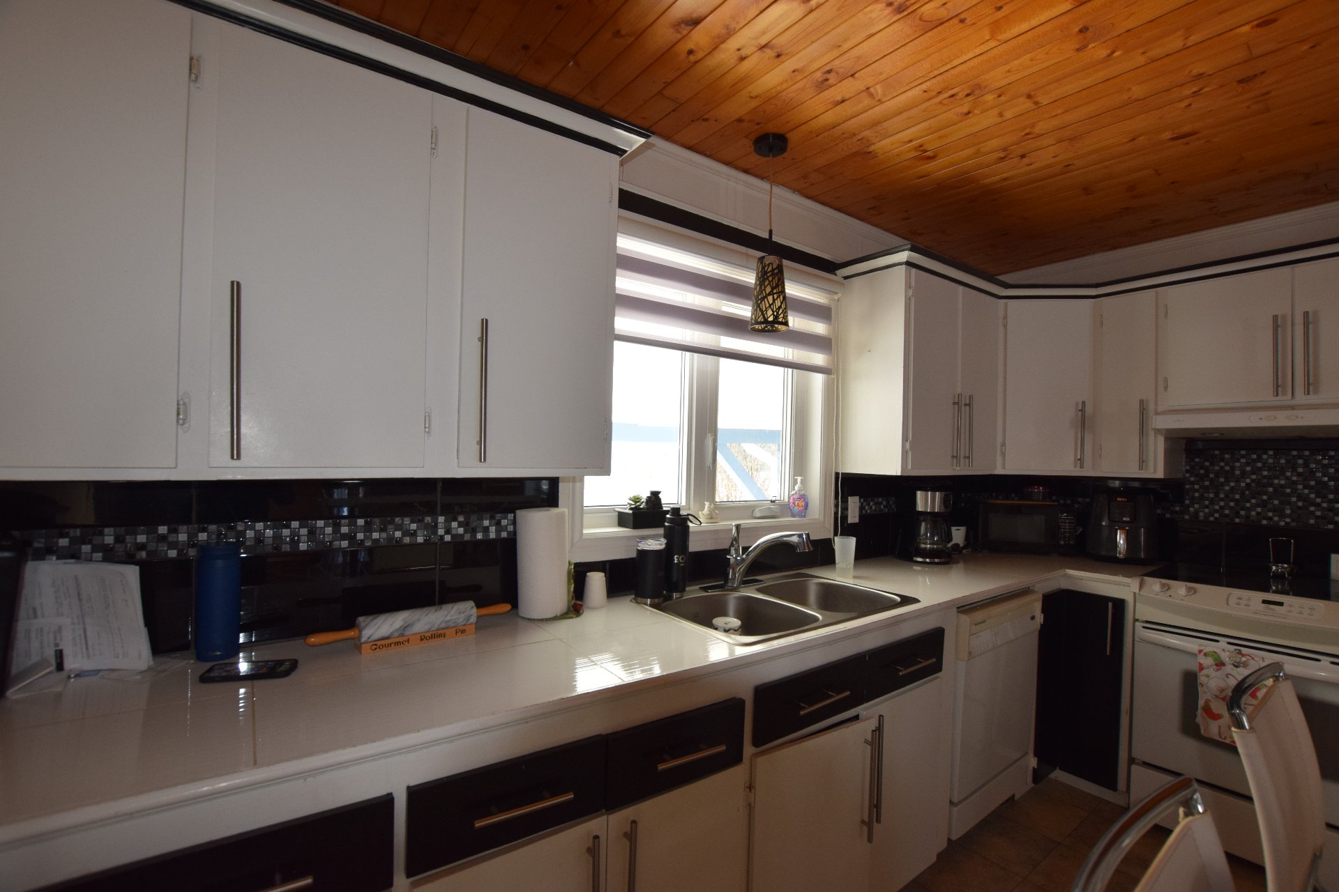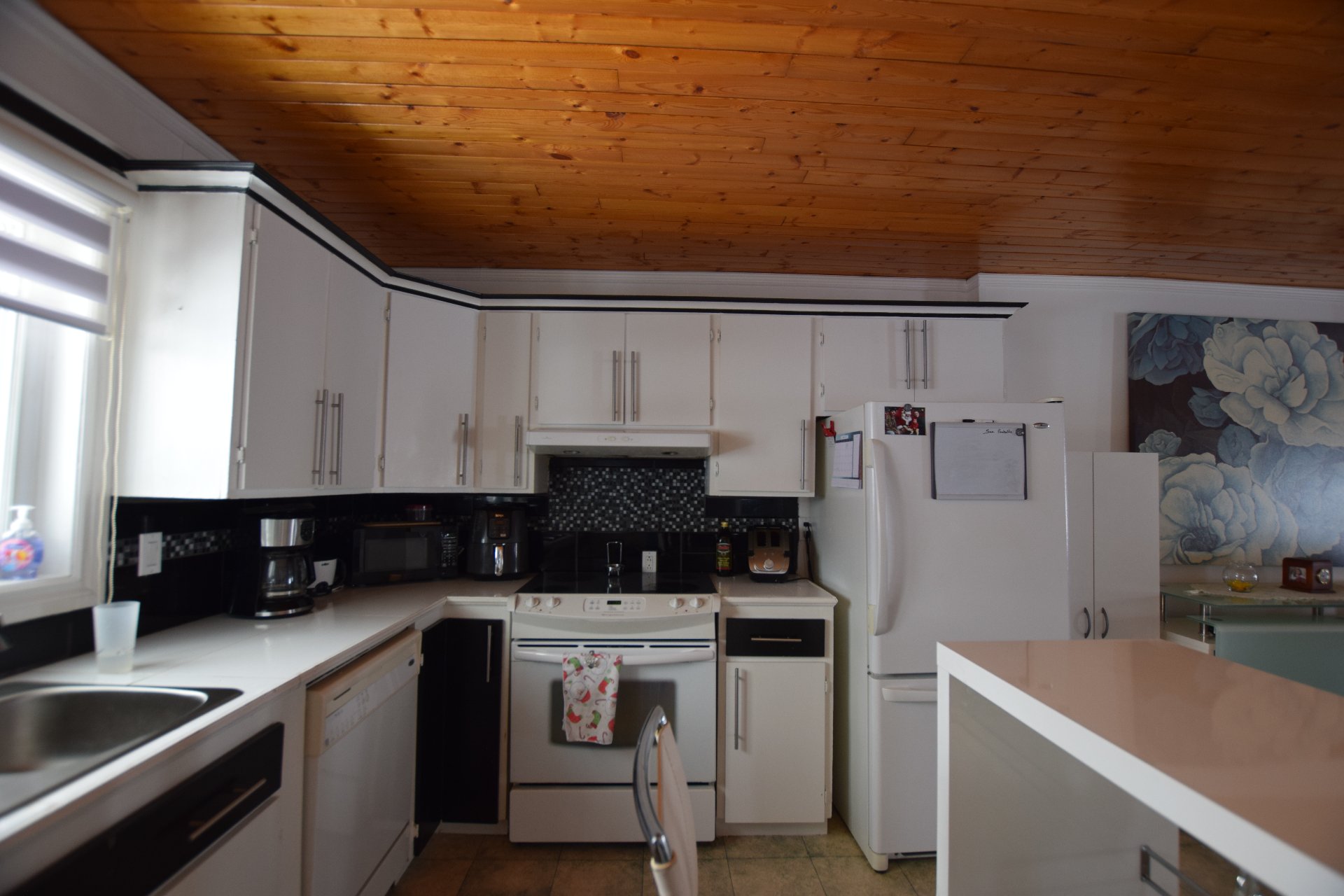 Deux foyers électriques, stores, rideaux, îlot et deux bancs, bac bleu et bac vert, luminaires, lave-vaisselle NON-FONTIONNEL.